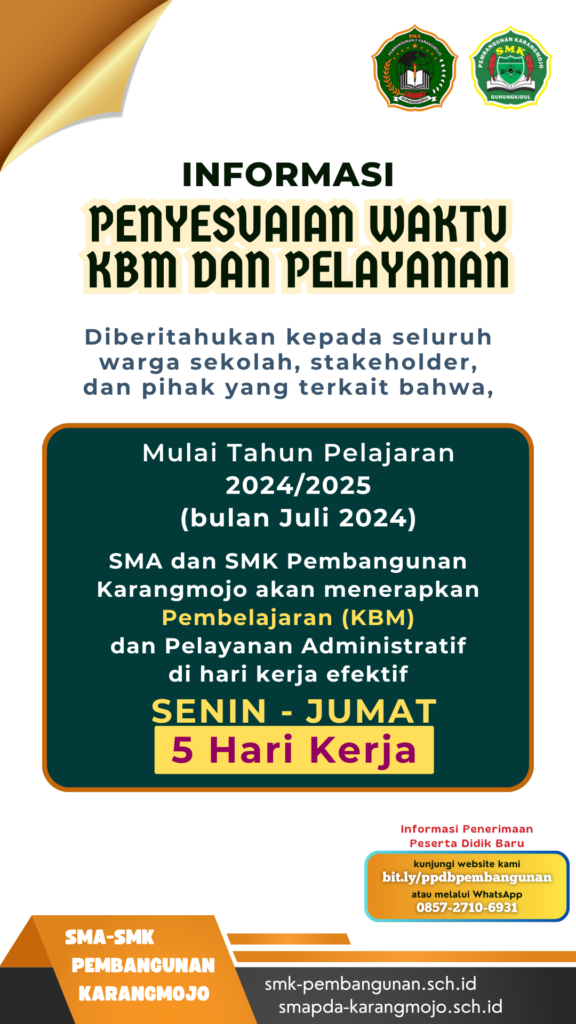 Blog 14 Mei 202414 Mei 2024 INFORMASI: Penyesuaian Waktu KBM dan Pelayanan Diposkan Oleh:Admin 0 Komentar INFORMASI